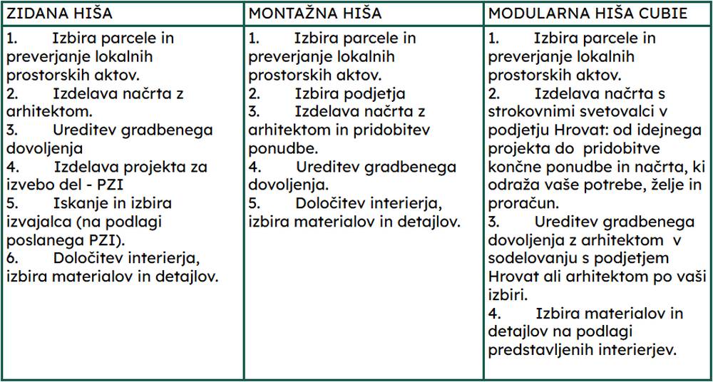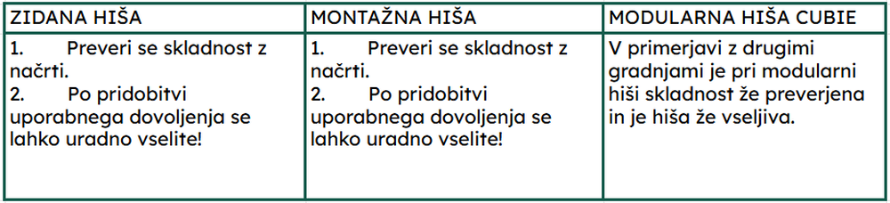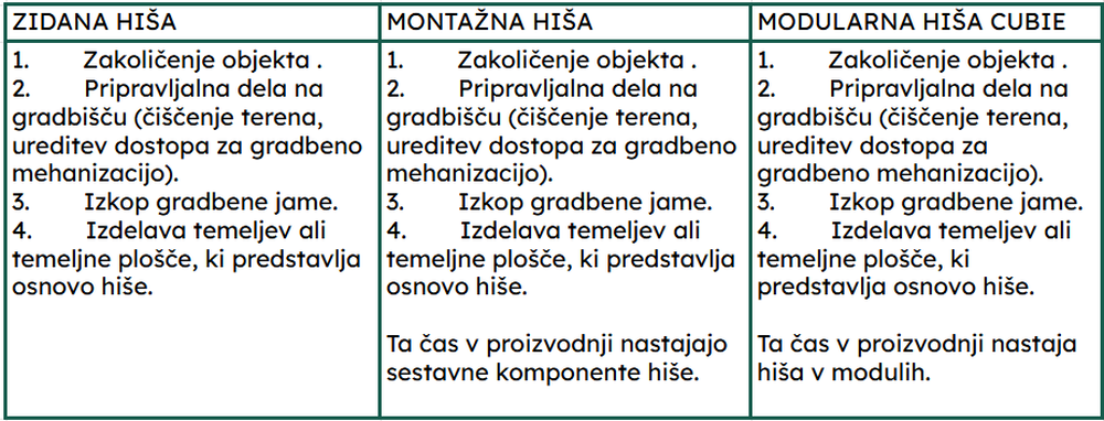 V vednost: Postopki pridobivanja dokumentacije (gradbenega dovoljenja) pred pričetkom gradnje zidane ali montažne gradnje se ne razlikujejo bistveno. Za modularne hiše je papirologija poenostavljena (večino dokumentov se drastično poenostavi ali odpade). Med tem, ko gradnja pri vseh 3 primerih poteka različno.