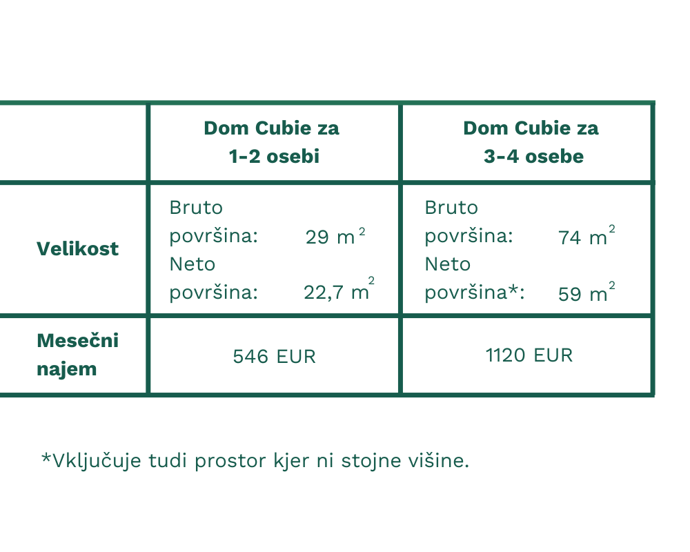 To ni mobilna hiška ali kontejner, zato ima svojo ceno. Najemnine Cubie hišk so primerljive z najemninami stanovanj v bloku enake kvadrature. Sam sem mnenja, da je kakovost bivanja, če je že potrebno plačevati najemnino, bistveno boljša v hiši, kot pa nekje v sedmem nadstropju stanovanjskega bloka. Pa še možnost odkupa imate.