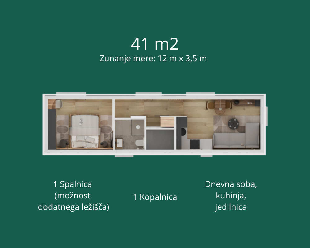 - Zunanje dimenzije: 12,1 x 3,5 m.